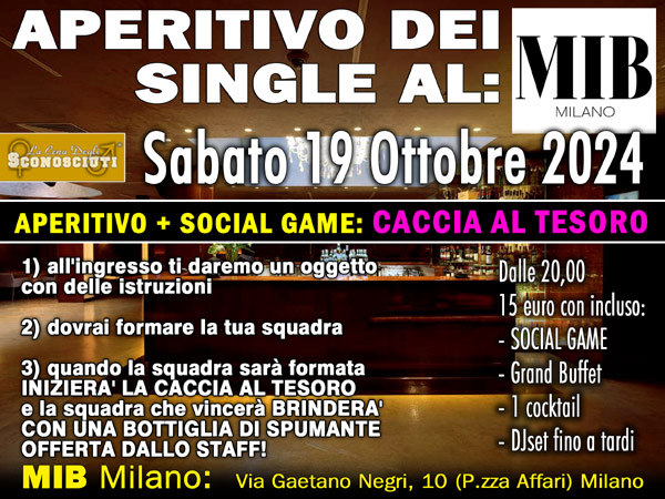 Sabato 19 Ottobre 2024 ore 20,00 ci ritroviamo per un fantastico aperitivo dedicato ai single al MIB Milano. Una bella serata con il SOCIAL GAME: CACCIA AL TESORO per socializzare con tutti velocemente! bella musica, bella gente. Avremo una zona con tavoli riservati per gli “Sconosciuti” e tanta bella musica da ballare.